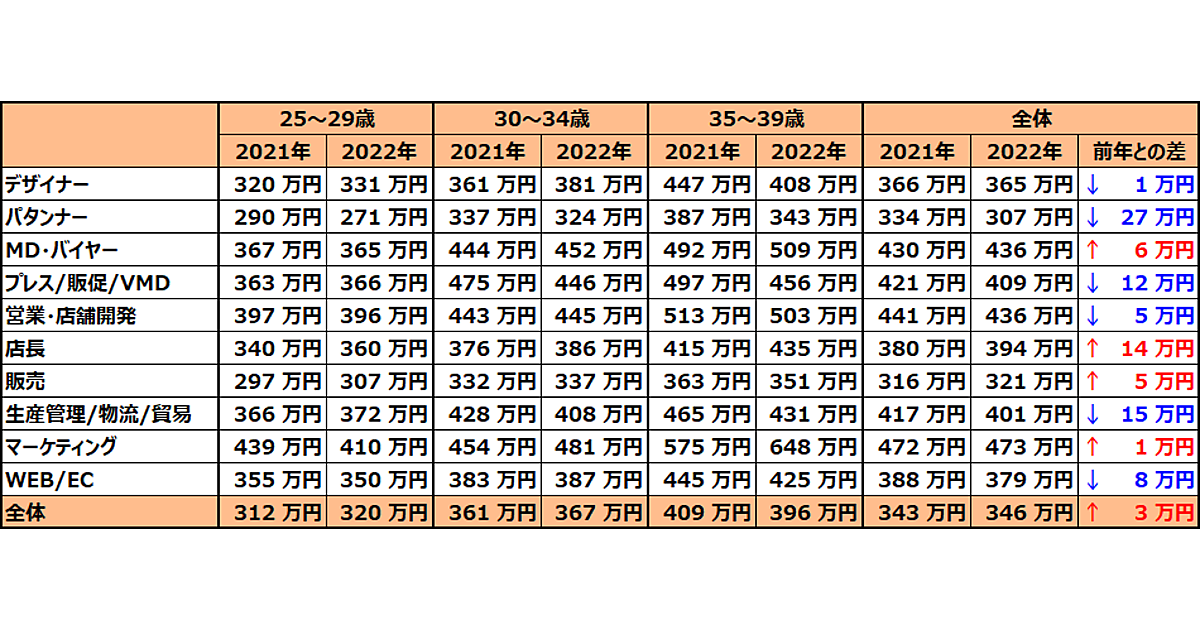 前年比で見ると、もっとも年収が上がったのは「店長」で14万円増、もっとも下がったのは「パタンナー」で27万円減だった。年代別では25~29歳は8万円増、30~34歳は6万円増、35~39歳は13万円減だった。