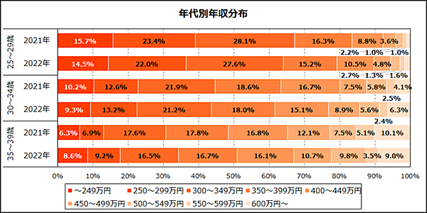 平均年収を見ると、25~29歳と30~34歳では300~349万円がボリュームゾーンで、前年と大きな変化はなし。一方で、25~29歳では400万円以上、30~34歳では450万円以上の人が増加し年収が底上げされた。