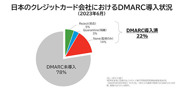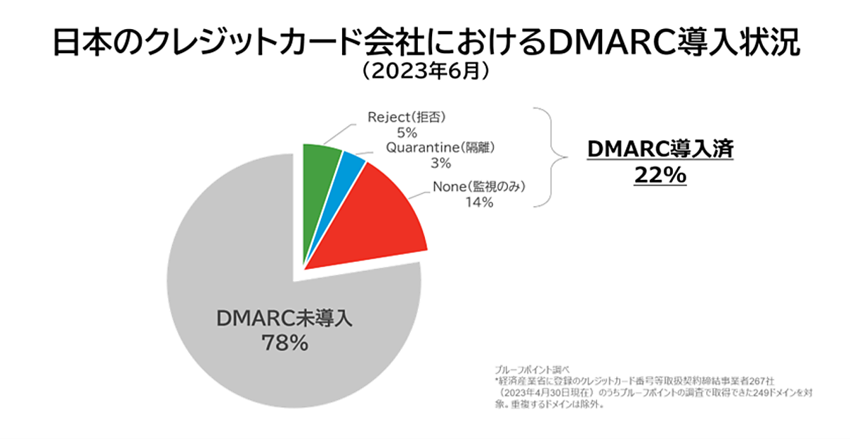 まず調査対象の249ドメインにおいて、メール認証プロトコルである「DMARC」は78%が導入していなかった。導入企業でも、現在推奨されているDMARCプロトコルのReject(拒否)を導入していたのは、わずか5%だった。ただし日本政府は2023年、クレジットカード会社に対しDMARC導入を推奨しており、今後のDMARC普及が予想されている。
