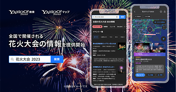 ヤフーは、「Yahoo!検索」と「Yahoo!マップ」(iOS版、Android版)の両サービスで全国約450カ所の花火大会の情報をWeb検索上や地図から確認できる機能の提供を始めた、と7月20日に発表した。花火に関して「花火大会 2023」などのキーワードで検索すると、検索結果面に全国の花火大会の情報が表示される。「今日」「明日」「明後日」「一週間以内」の日付を表示条件として絞り込むこともできる。
