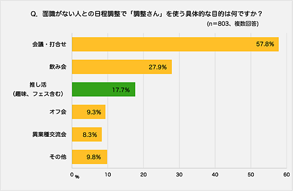 「面識がない人と日程調整をする目的」について聞くと、「会議・打ち合わせ」57.8%が圧倒的多数ながら、「飲み会」27.9%がそれに続く。そして「推し活(趣味、フェス含む)」が17.7%で3番目の多さとなった。ビジネス用途に限らず、日程調整ツールが使われていることがうかがえる。