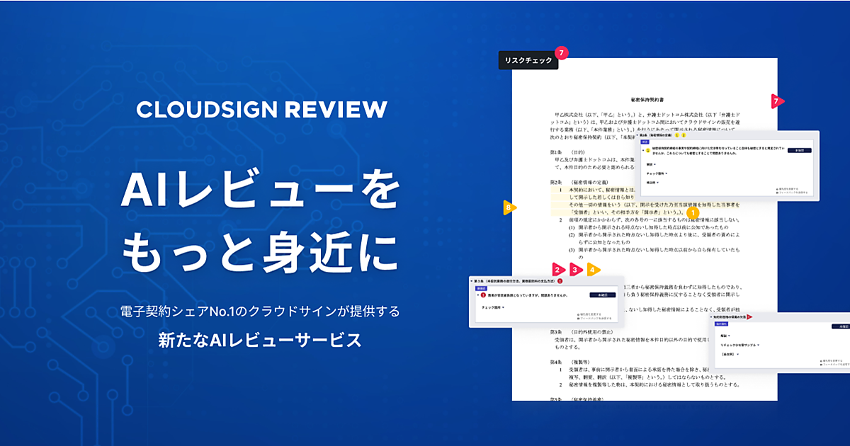専門弁護士が作成した解説や自社に有利な条文サンプルが表示されるので、高度な専門知識がなくてもレビューの工数を大幅削減できる。弁護士ドットコムは契約締結、契約管理に次ぐ3つ目の柱としてAIレビュー支援サービスに参入した。リセが築いた高いレビュー技術をクラウドサインに組み込み、AIレビュー支援市場でのシェアトップを目指す。