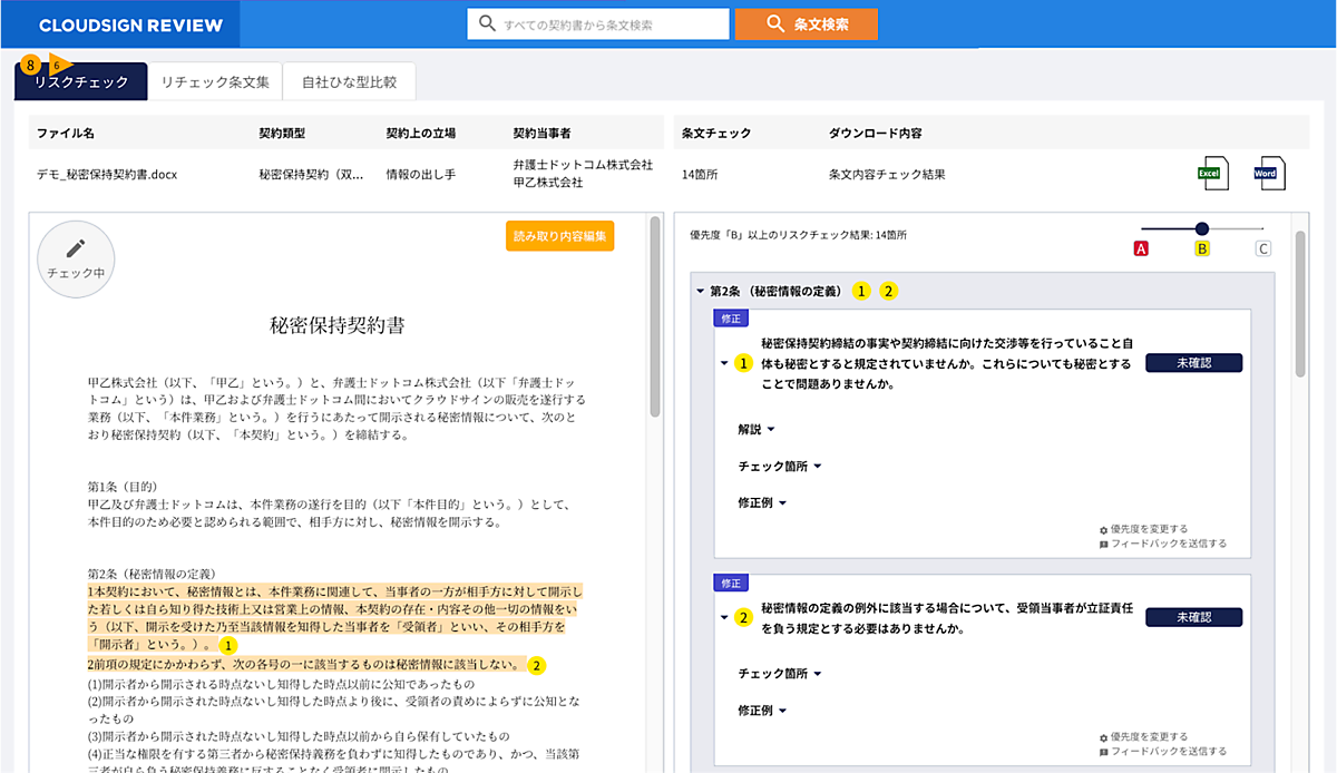 クラウド電子契約「クラウドサイン」を展開する弁護士ドットコムは、契約書レビューと作成支援の「LeCHECK」を提供するリセと資本業務提携し、AI(人工知能)による契約書の自動レビュー支援サービス「クラウドサイン レビュー」を提供する、と7月21日に発表した。AIが契約書の不利な条項を指摘し、欠落条項や要注意条項、解説を自動表示する。