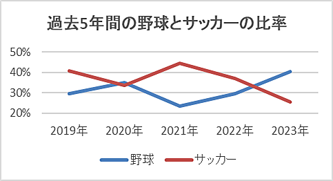 男女別に見ると、男の子の将来就きたい職業は、前年・前々年に続き「スポーツ選手」が1位。内訳を見ると、大谷翔平(エンゼルス)やヌートバー(カージナルス)の活躍、日本優勝で大きく話題となったワールド・ベースボール・クラシック人気を背景に、野球(40.3%)がサッカー(25.4%)を上回り3年ぶりにトップとなった。