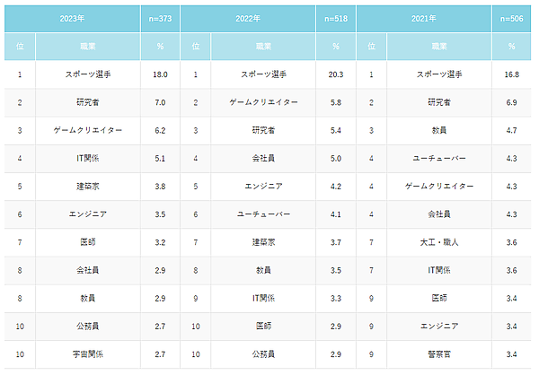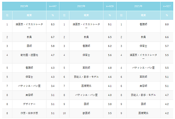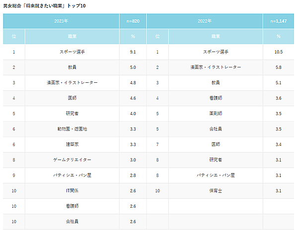 一方女の子の「将来就きたい職業」は、前年初トップとなった「漫画家・イラストレーター」が、2年連続で1位となった。同じ創作関連では、「作家・絵本作家」も過去最高の8位に躍進している。