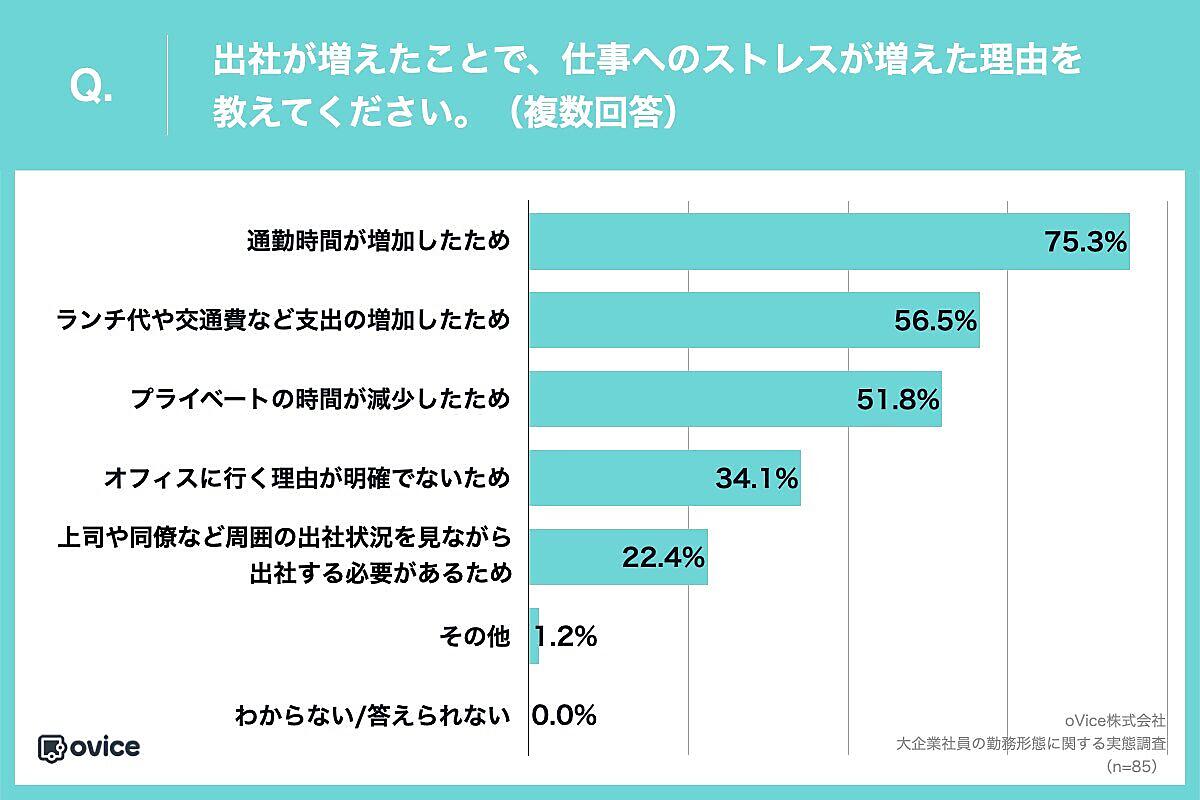 出社によるストレスが増加したという85人に理由を聞くと、「通勤時間が増加したため」75.3%、「ランチ代や交通費など支出の増加したため」56.5%、「プライベートの時間が減少したため」51.8%といった回答が多い。