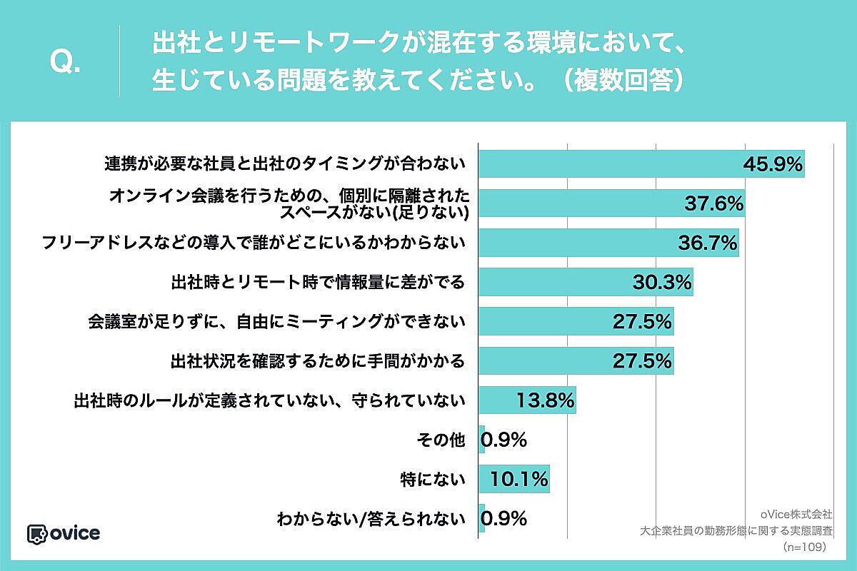 また「出社とリモートワークが混在する環境において生じている問題」を全体に聞くと、「連携が必要な社員と出社のタイミングが合わない」45.9%、「オンライン会議を行うための、個別に隔離されたスペースがない(足りない)」37.6%、「フリーアドレスなどの導入で誰がどこにいるかわからない」36.7%といった不満があがった。