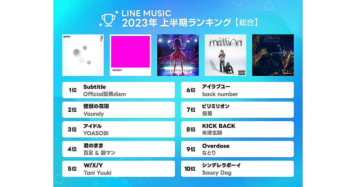 LINE MUSICは、「LINE MUSIC 上半期ランキング2023」を発表した。2023年上半期に最も人気だった楽曲をランキング形式でまとめている。