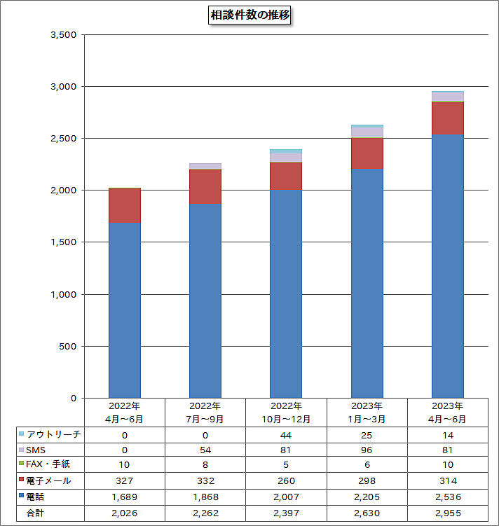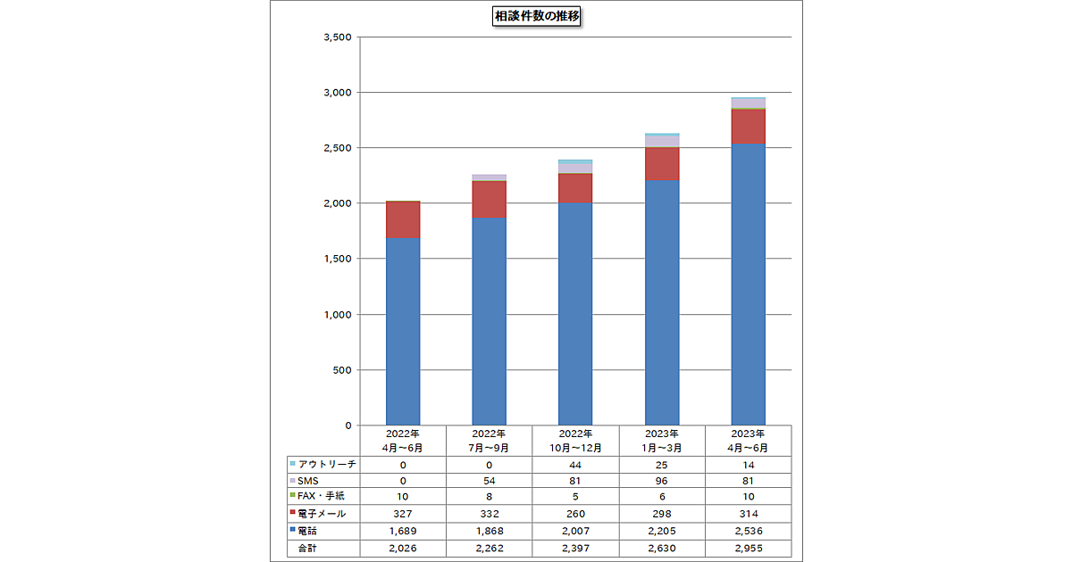 それによると該当四半期の相談対応件数は2,955件で、ここ1年ほどは増加傾向が続く。前四半期(1月~3月)からは約12.4%の増加だった。