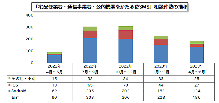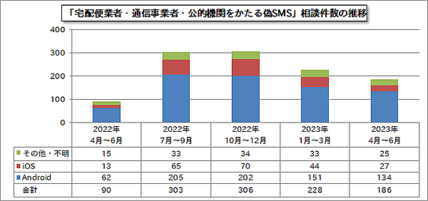 その他では、「宅配便業者・通信事業者・公的機関をかたる偽SMS」は前四半期から約18.4%減少し186件にとどまった。「不正ログイン」に関する相談は前四半期から約35.1%増加したが100件にとどまり、全体に占める割合は低い。「暗号資産(仮想通貨)で金銭を要求する迷惑メール」は前四半期から約53.3%増の46件だった。Emotetに関する相談は下火で、今期は1件のみだった。