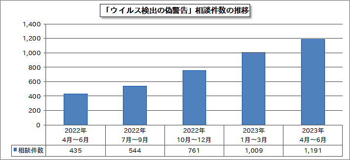 内容別で最も多かったのは、ウイルスを検出したという偽警告で不安を煽る「ウイルス検出の偽警告」で、前四半期から約18.0%増の1,191件の相談が寄せられた。
