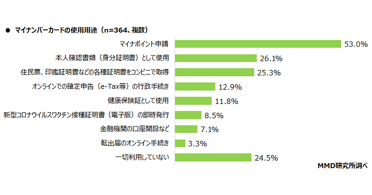 MMDLabo株式会社が運営するMMD研究所は、「マイナンバーカード」に関する実態調査の結果を発表した。マイナンバーカード所有者364人が回答している。