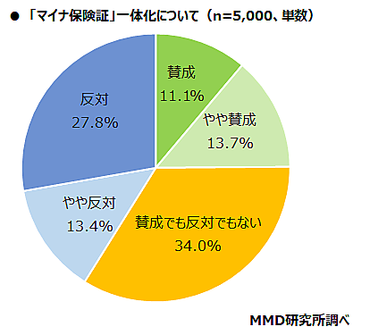 あらためて全体5,000人に「現在の健康保険証を廃止し、マイナ保険証に一体化すること」について聞くと、「賛成」11.1%、「やや賛成」13.7%に対し、「反対」27.8%、「やや反対」13.4%と、反対派が大きく上回っている。
