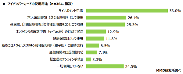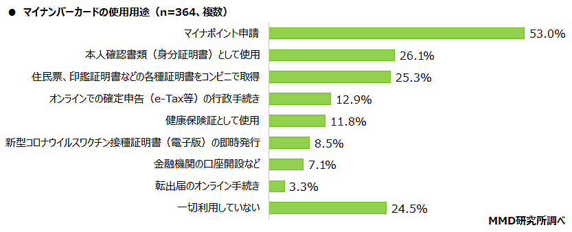 次に、マイナンバーカードを所有しているとした364人に「マイナンバーカードの使用用途」(複数回答)を聞くと、「マイナポイント申請」53.0%が最多。以下「本人確認書類(身分証明書)として使用」26.1%、「住民票、印鑑証明書などの各種証明書をコンビニで取得」25.3%が続いた。
