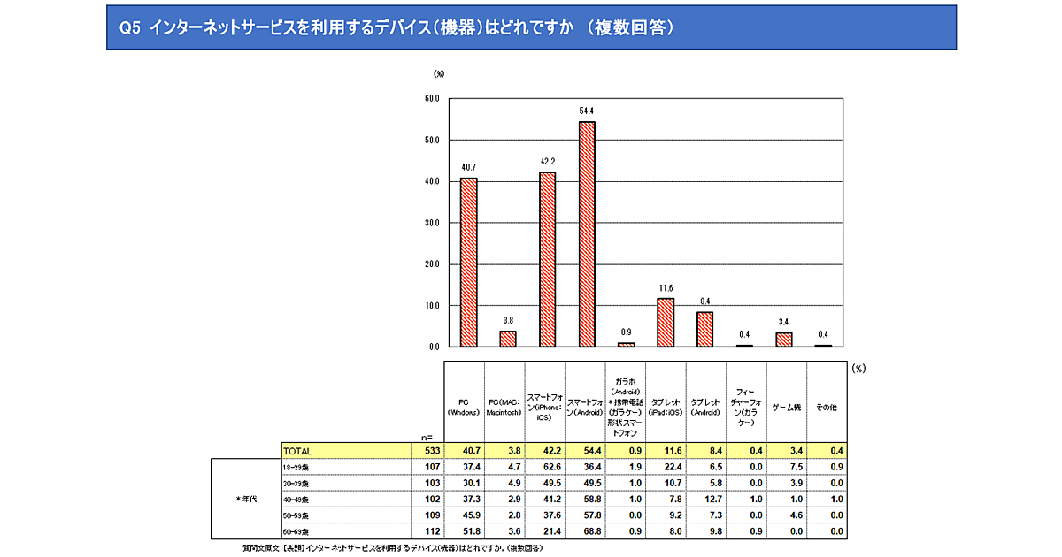 変化があった個所・注目すべき個所としては、まず「PCの利用が大幅に減少した」(前回66.2%→40.7%)ことがあげられている。特に若い年代での減少が大きい。理由については、「スマホで完結できることが増加した」「スマホ利用だけを想定したサービスが増加した」などが考えられる。