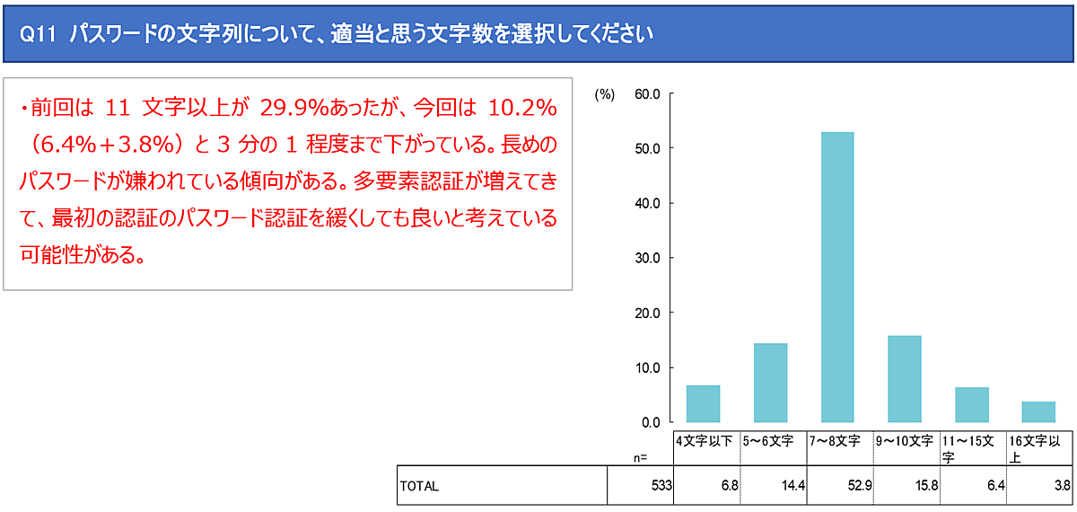 また「適切と思うパスワード文字列の長さ」が、より短くなっていた。その結果、パスワード長は7~8字で十分と考える人が半数を超えた。これは「多要素認証が増えた」「サービス提供者側の要求に従うことで十分と思われている」といった理由が推察されている。前述のように、スマホベースのサービスが増えたことでパスワード入力が簡素化されている可能性も考えられる。