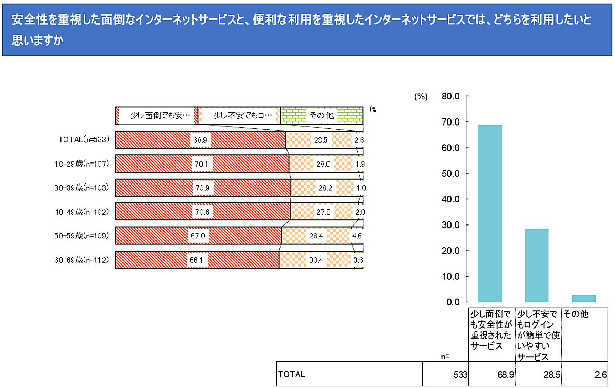 「パスワードを使いまわしている」という人は前回17.4%→28.1%と増加。危険性が高まっている一方で、「少し面倒でも安全性を重視したサービスを利用したい」前回58.0%→68.9%、「少し不安でも簡単重視」前回39.5%→28.5%と、矛盾する言動も見られる。