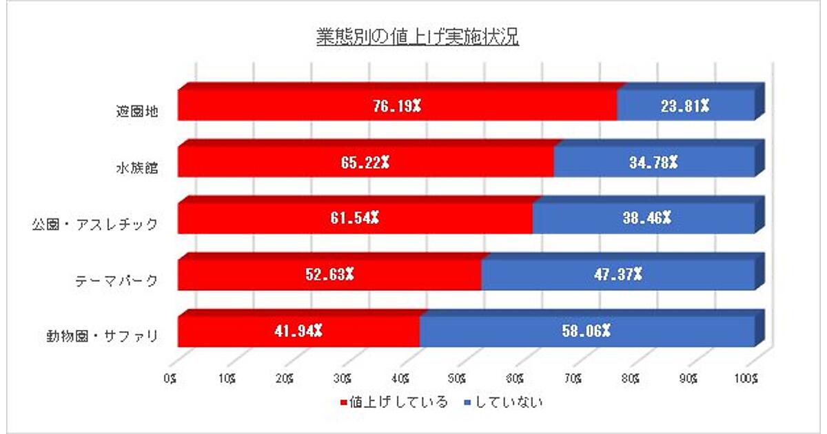 業態別で見ると、値上げ実施施設の割合が最も多かったのは「遊園地」76.1%。以下「水族館」65.2%、「公園・アスレチック」61.5%、「テーマパーク」52.6%は過半数が値上げを実施。一方で「動物園・サファリパーク」は41.9%と、値上げしなかった施設のほうが多かった。