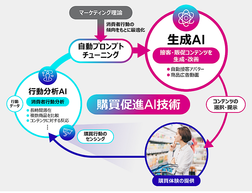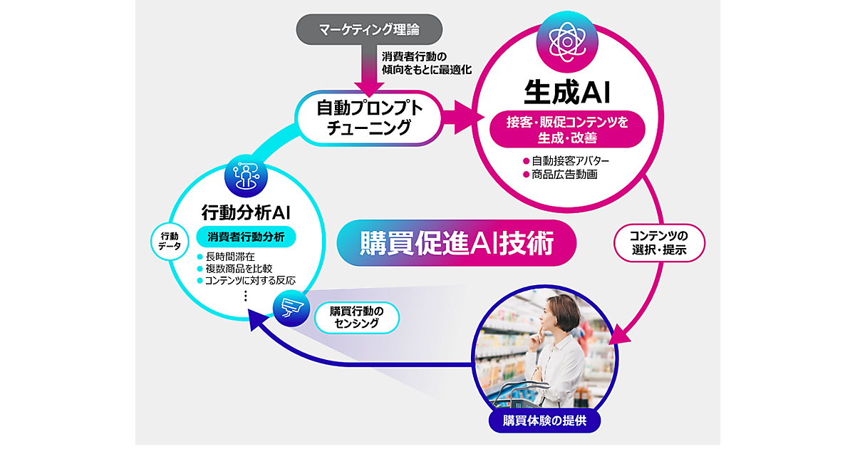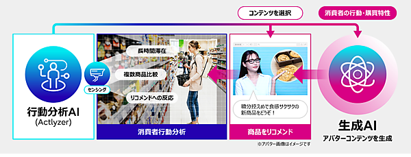 店内に設置するカメラ映像で来店者の行動パターンや購買特性を分析。個人を特定できないデータ形式で処理した上で、事前に生成AIをベースに作成した各商品を推薦する文章をアバターが読み上げて商品を自動で推薦する。実証実験の期間を通じて、アバターによる商品自動推薦の効果やアバターの改善効果、店舗や商品の売上への貢献などの有効性を検証する。実験はリテールAI研究会が支援する。