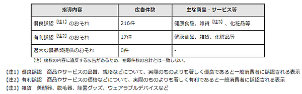 それによると2022年度は、24,000件のインターネット広告を監視し、205事業者(218件の広告)に対し改善指導を行ったとのこと。218件のうち、「優良誤認のおそれ(品質、規格の誤認)」にあたるものが216件とほとんどを占めている。残りは「有利誤認のおそれ(価格の誤認)」が17件だった(違反の重複あり)。