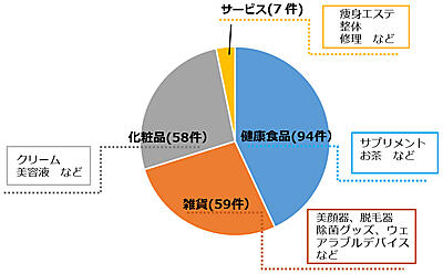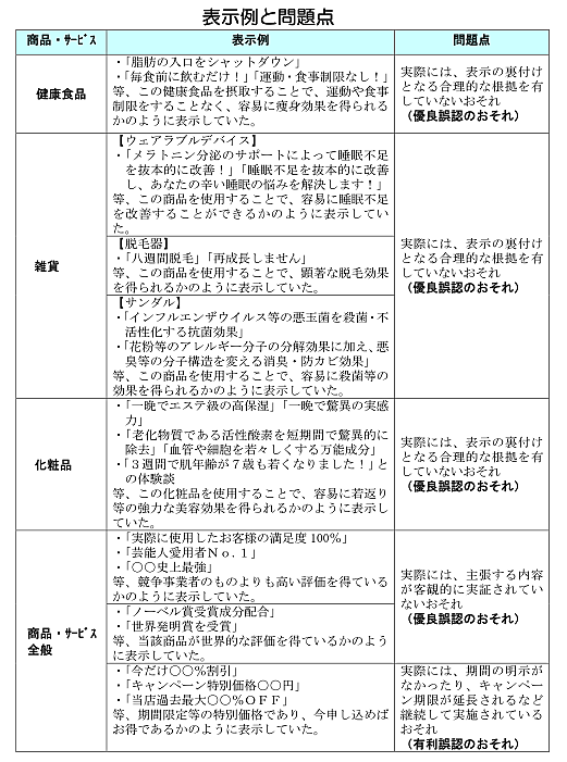 具体的には、「飲むだけで痩せるといった、薬や医療行為のような効果を表示」「事実に基づかない“期間限定”“No.1”といった表示」など、誇大な効果をうたう広告が健康食品や雑貨に多く見受けられた。