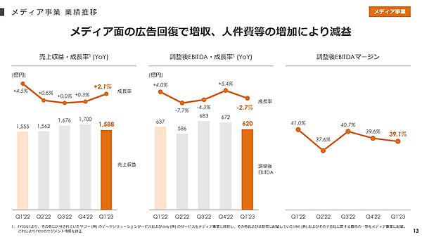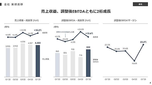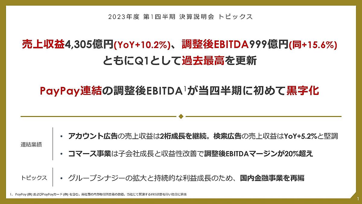 Zホールディングス(ZHD)が8月3日に発表した2023年4~6月期(第1四半期)の連結決算は、売上収益が前年前期比10.2%増の4305億円、重視する調整後EBITDA(利払い・税引き・償却前利益)は同15.6%増の999億円で、ともに過去最高を更新した。増収は22年10月のPayPayの連結子会社化に伴うもの。増益は販促費削減やLINE証券の事業見直しなどで確保した。PayPay連結のEBITDAは17億円で、四半期ベースで初めて黒字転換した。