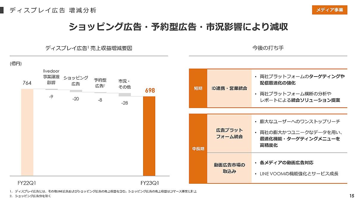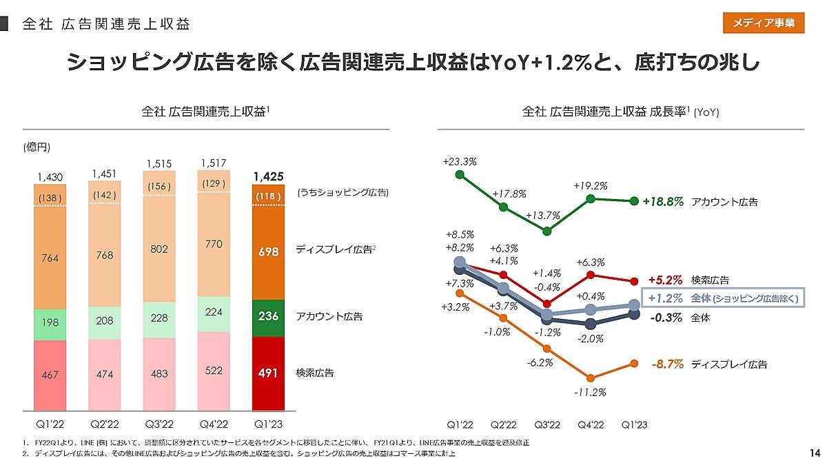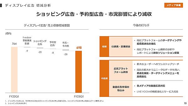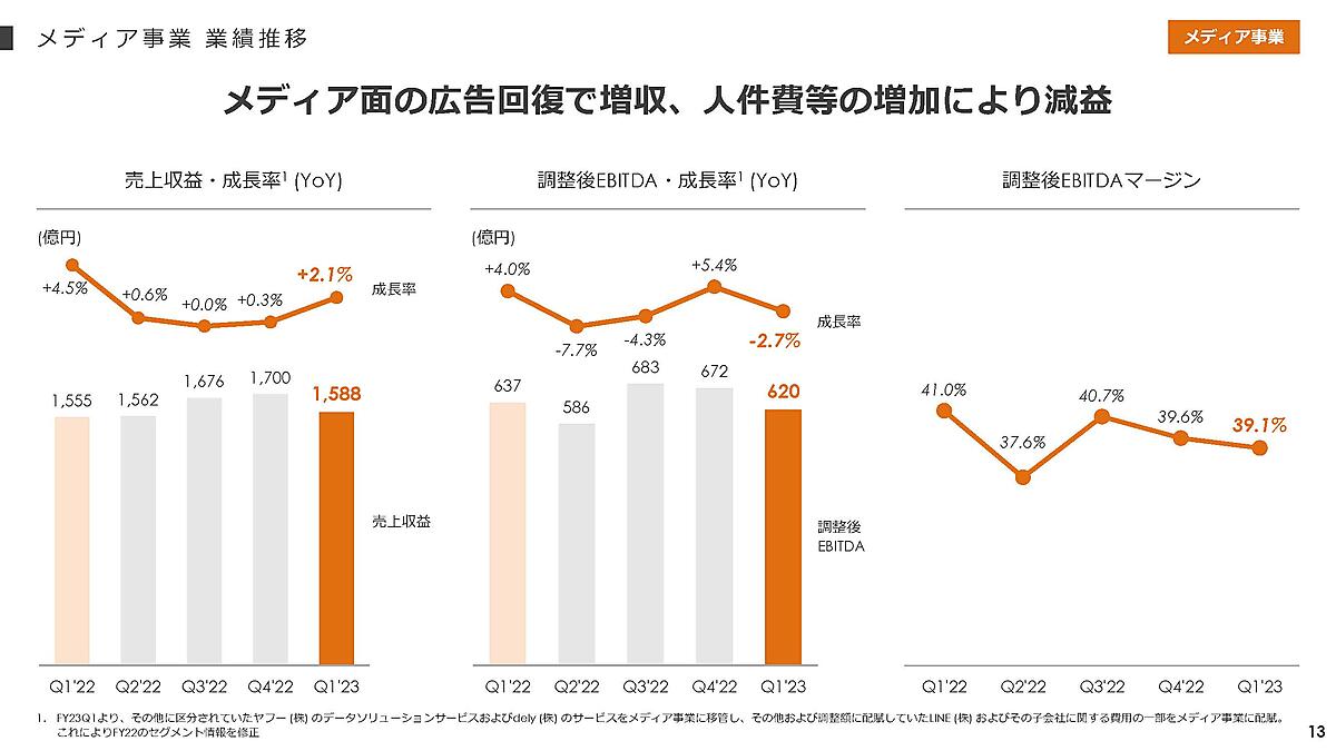メディア事業は、売上収益が同2.1%増の1588億円で増収も、人件費等の増加でEBITDAは同2.7%減の620億円と減益だった。ディスプレイ広告が予約型の出稿減で減収だったが、LINE MUSICの連結子会社化と、「LINE公式アカウント」の6月の料金プラン改定で有償アカウント数が増えてアカウント広告の売上収益が同18.8%増えた。検索広告は堅調で同5.2%増加。メディア事業が全売上収益に占める割合は36.9%だった。