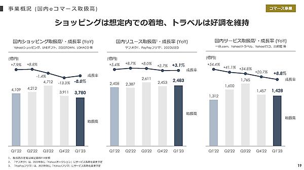 コマース事業は、売上収益が同0.6%増の2068億円で、前年同期と同水準にとどまった。アスクルグループやZOZOグループが増収で、トラベル事業は好調を維持している。事業コストの見直しで収益性が改善し、EBITDAは同24.2%増の465億円で増益だった。コマース事業が全売上収益に占める割合は48.0%。ただeコマース取扱高のうち、国内物販系の取扱高は同1.9%減の7177億円と伸び悩んでいる。