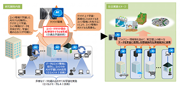 コンソーシアムは、①マルチモーダルAI技術の開発・高度化、②エッジAI技術の開発・高度化、③連合学習技術の開発・実用化――の3つの活動を行う。さらに3つの活動を組み合わせた分散型機械学習技術を活用して、具体的な社会実装シーンを想定した技術実証を行う。確立した分散型機械学習技術によって、多様なデータを安全に連携させる「データ連携AIプラットフォーム」を創出し、分野を横断したデータ活用を推進する。