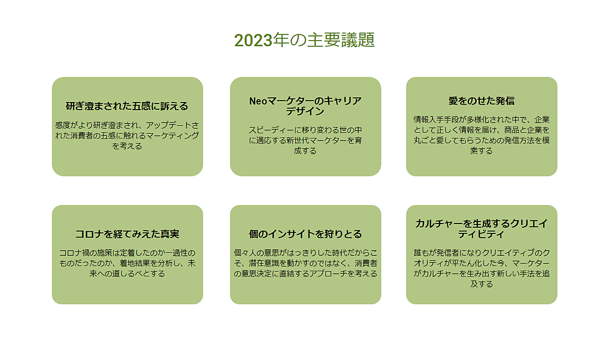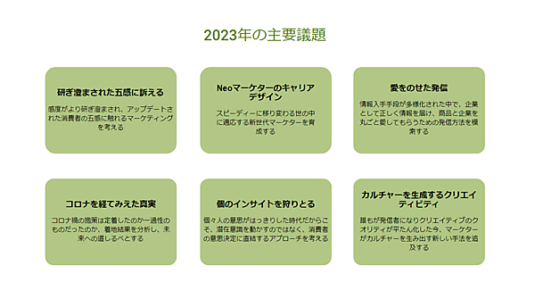 「CMO Japan Summit 2023」では、コーヒーブレイクやネットワーキングランチを含む多くの交流の時間を所々に挟みながら、基調講演・ケーススタディプレゼンテーション・パネルディスカッションを通じて、現在の市場環境下における課題やビジネスチャンスについての活発な議論を行う。2023年の主要議題は次の6つ:
