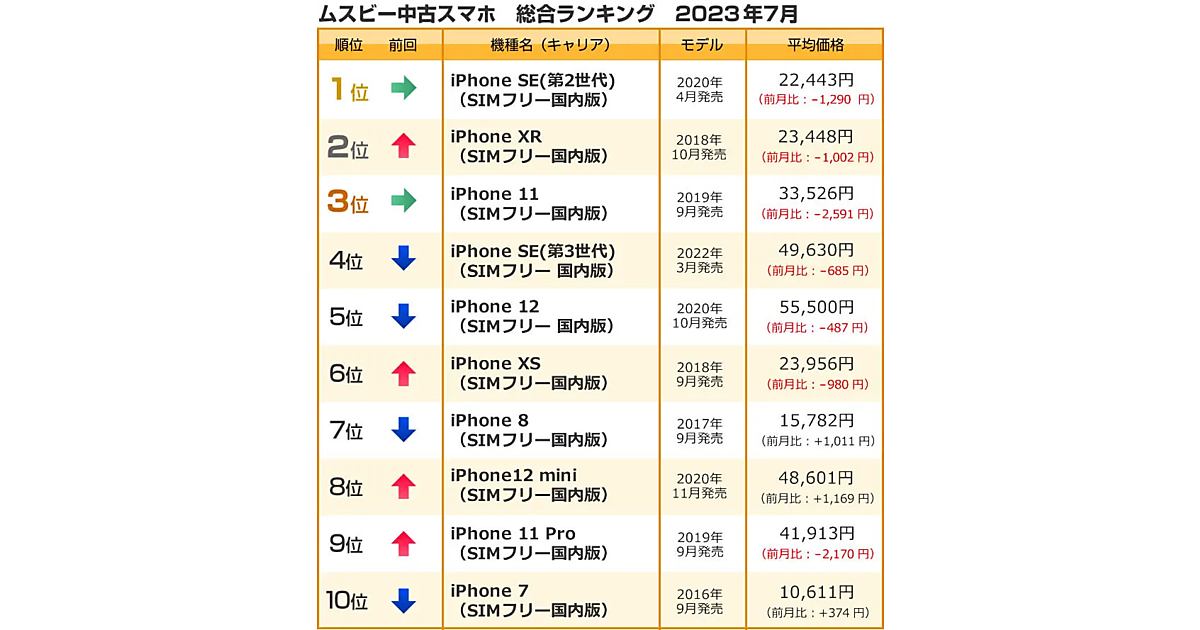 ウェイブダッシュが運営するフリーマーケットサイト「ムスビー」は、2023年7月の中古スマホ・中古タブレットランキングを発表した。