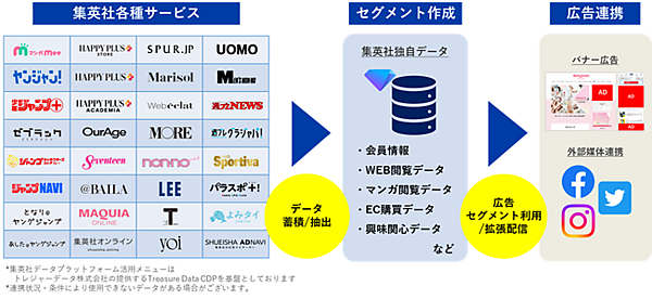 集英社は、広告配信・分析サービス「Shueisha Data +(集英社データプラス)」を8月に始めた、と8月7日発表した。同社が展開するマンガアプリ、雑誌ウェブメディア、ECサイトなどで取得した閲覧情報や購買情報などのデータ(1st Partyデータ)を同社のカスタマーデータプラットフォーム(CDP)上で統合し、広告配信・分析に活用する。