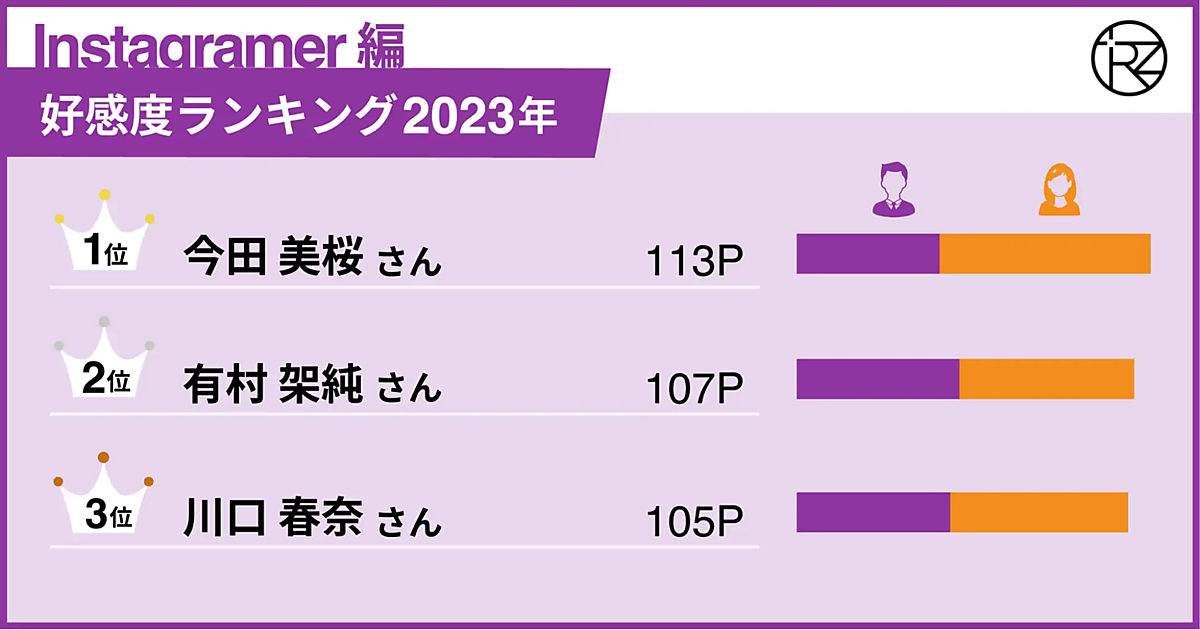 インスタグラマー編では「今田美桜」が1位。ドラマ『花のち晴れ〜花男 Next Season〜』の出演をきっかけにフォロワー数が増加した。2位は現在大河ドラマでも活躍している「有村架純」、3位はドラマ『Silent』が大ヒットした「川口春奈」と続いた。