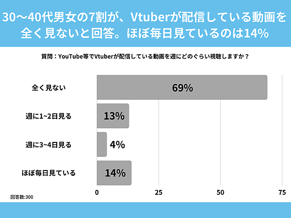 まず「YouTube等でVTuberが配信している動画を週にどのぐらい視聴しますか?」と聞くと、「まったく見ない」69%が圧倒的多数だったが、「ほぼ毎日見ている」と14%がそれに続く。「週に1~2日見る」13%、「週に3~4日見る」4%も一定数存在した。