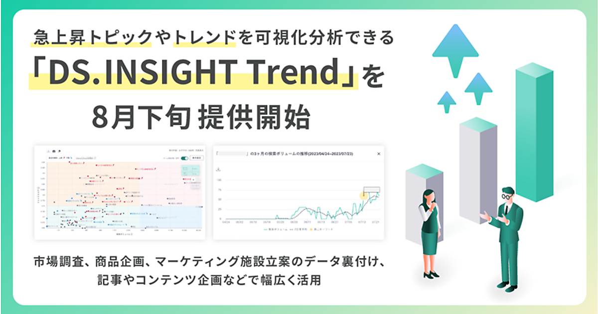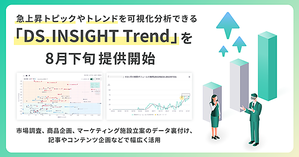 ヤフーは、データソリューションサービスで、検索データなど「Yahoo! JAPAN」のビッグデータがブラウザ上で調査・分析可能なツール「DS.INSIGHT」に、新機能「DS.INSIGHT Trend」を加えた、と8月8日発表した。急上昇トピックやトレンドが可視化分析でき、市場調査、商品企画、マーケティング施策立案、コンテンツ企画に役立てられる。8月下旬に提供を始める。
