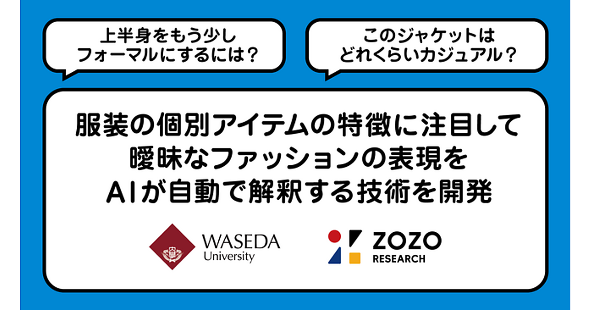 ファッション通販サイト「ZOZOTOWN」を運営するZOZOのグループで技術研究・製品開発を行うZOZO NEXTは、同社の研究開発組織、ZOZO研究所と、早稲田大学大学院創造理工学研究科の研究グループが、服装の個別アイテムの特徴に注目して曖昧なファッション表現をAI(人工知能)が自動解釈する技術を開発した、と8月8日発表した。より詳細な質問に回答できる。