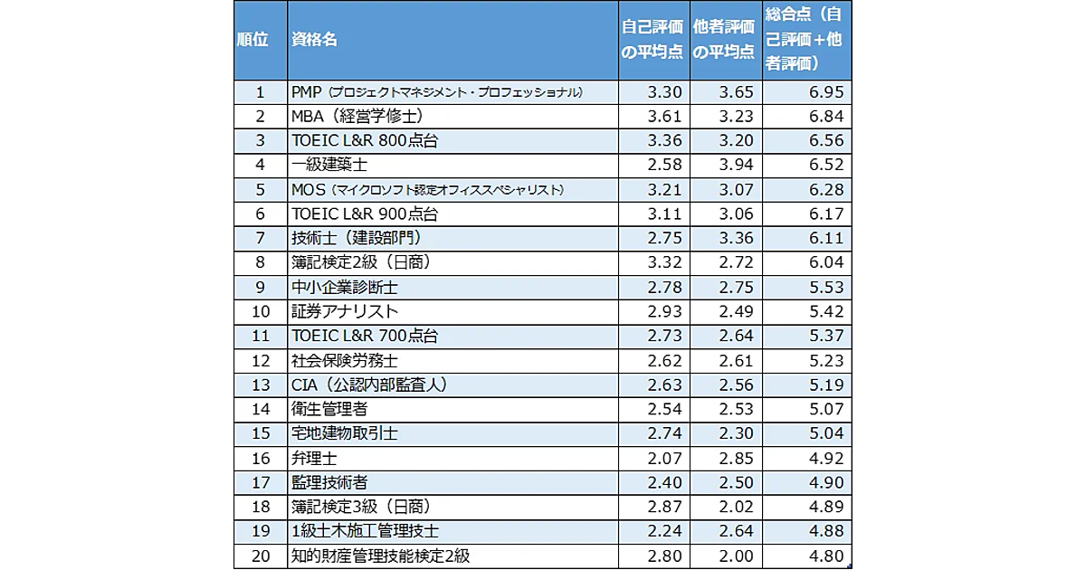 - 【調査方法】メールにて依頼し、Webサイトで回答 ※評価された資格の集計方法について:取得資格について、自己評価(仕事で役に立った)と他者評価(会社で評価された/転職市場で評価された)を0点~5点で点数付け。有効回答のうち、自己評価の平均点と他者評価の平均点を単純合計し、総合点とした。