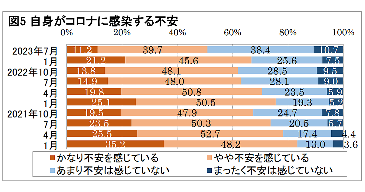 また、自身が新型コロナに感染する不安について、かなり不安・やや不安を合計した割合は50.9%となり、調査開始以来最小を記録した。
