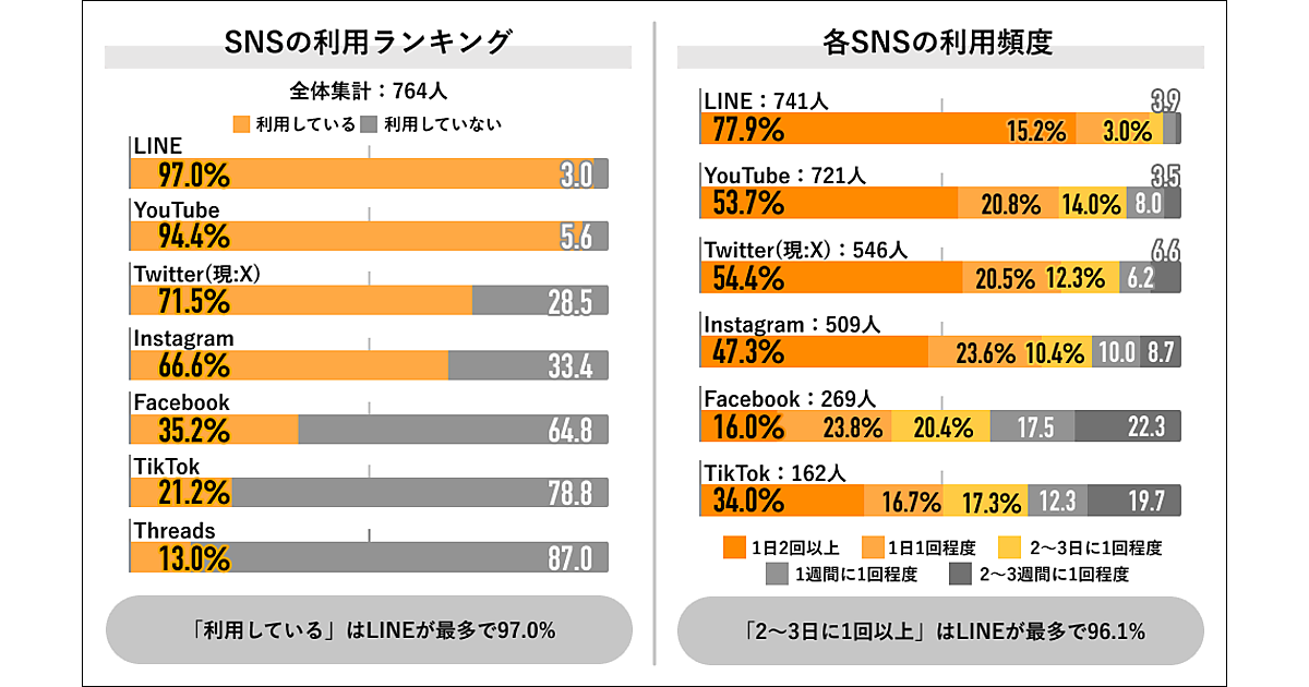 調査によると、主要SNSで利用率が最も高いのは「LINE」で97.0%。以下「YouTube」「Twitter(現:X)」「Instagram」と続いた。また各SNSの利用頻度としては、いずれにおいても「1日に2回以上」の高頻度で利用している人が多かった。
