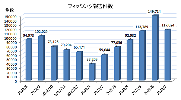 2023年7月のフィッシング報告件数(海外含む)は、前月149,714件より大幅に減少し117,024件だった。10万件は超えたが、過去最高を記録した6月から約21.8%の減少を示している。