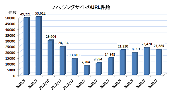 フィッシング対策協議会は、2023年7月に寄せられたフィッシング報告件数(海外含む)の集計結果を発表した。同協議会では、事業者などに寄せられた問い合わせ情報をリアルタイムに集約し、共有データベース化している。