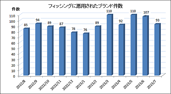 2023年5月に悪用されたブランド件数(海外含む)は、前月より14件減少し93件。内訳はクレジット・信販系22ブランド、金融系20ブランド、通信事業者・メールサービス系15ブランド、配送系6ブランド、EC系5ブランド、官公庁5ブランドなどだった。