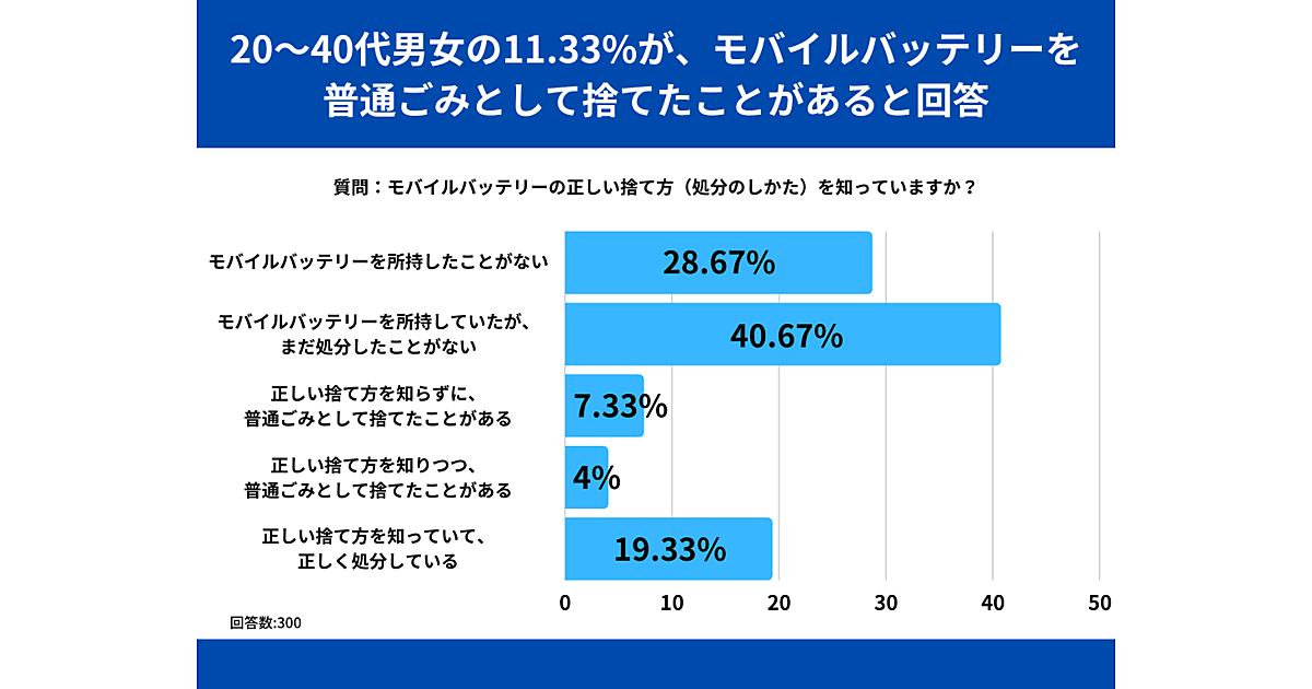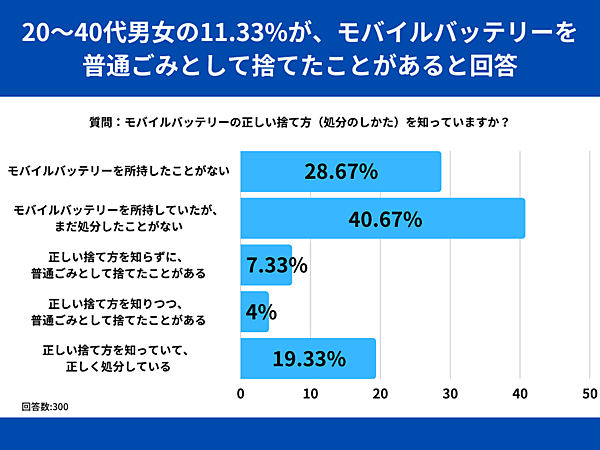 SheepDogは、「モバイルバッテリーの捨て方」に関する調査結果を発表した。20歳~49歳の男女300人から回答を得ている。