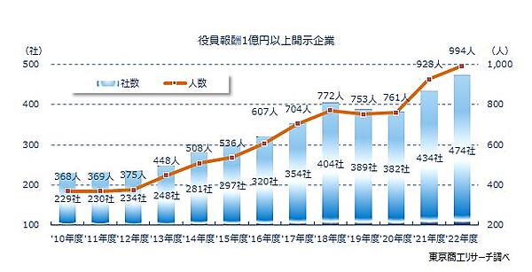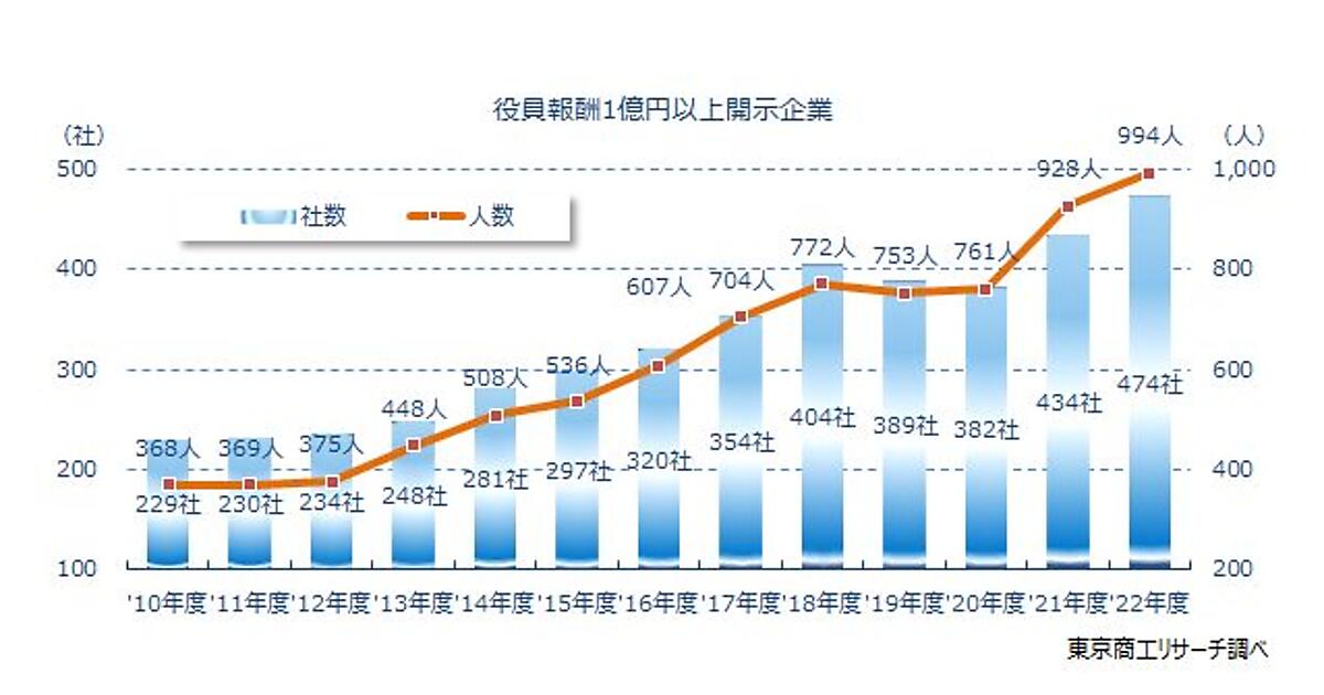 2023年6月30日時点の上場企業3,899社において、2022年度に1億円以上の役員報酬を開示した上場企業は474社(994人)。前年度より社数は40社増、人数は66人増で、社数・人数ともに過去最多を更新した。
