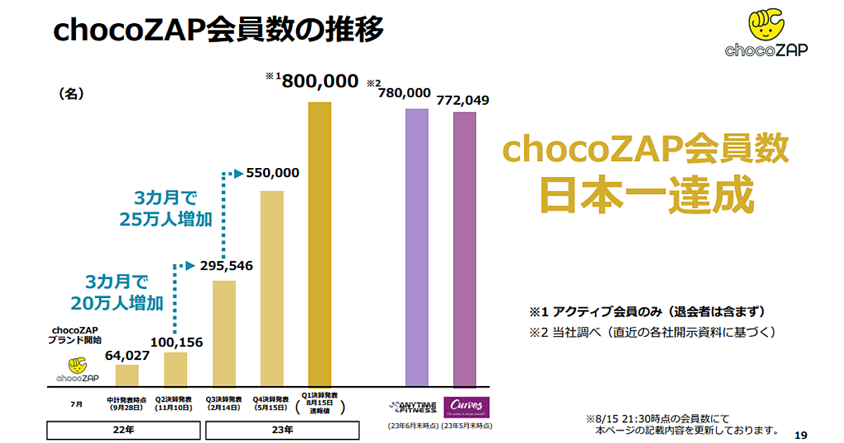 減量ジム「RIZAP(ライザップ)」など展開するRIZAPグループは、連結子会社のRIZAPが運営する低価格ジムの「chocoZAP(チョコザップ)」の会員数が80万人になった、と8月15日に発表した。国内フィットネスジムの会員数では、開示されている情報に基づいた同社の調べで「日本一の会員数を達成した」としている。