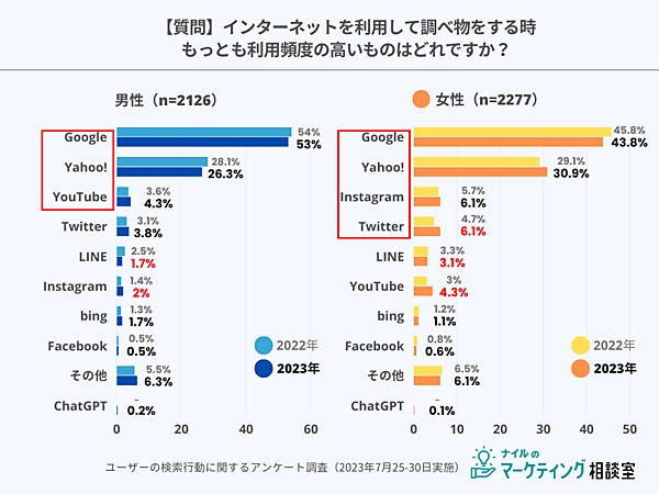 まず「インターネットを利用して調べものをするときもっとも利用頻度が高いサービス」を聞くと、1位「Google」48.2%が圧倒的に多く、「Yahoo!」28.7%がそれに続いた。これは男女ともに同一だが、3位以降を男女別で見ると、女性は3位「Instagram」6.1%、4位「Twitter」6.1%だったのに対し、男性は3位「YouTube」4.3%、4位「Twitter」3.8%と差異が見られた。