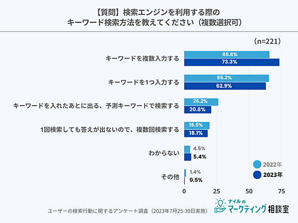 検索エンジン(Google、Yahoo!など)を利用する221人で「検索方法としてもっとも多かったもの」は「キーワードを複数入力する」73.3%、次いで「キーワードを1つ入力する」62.9%だった。「キーワードを複数入力する」は前年から7.7ポイントと大きく増加している。