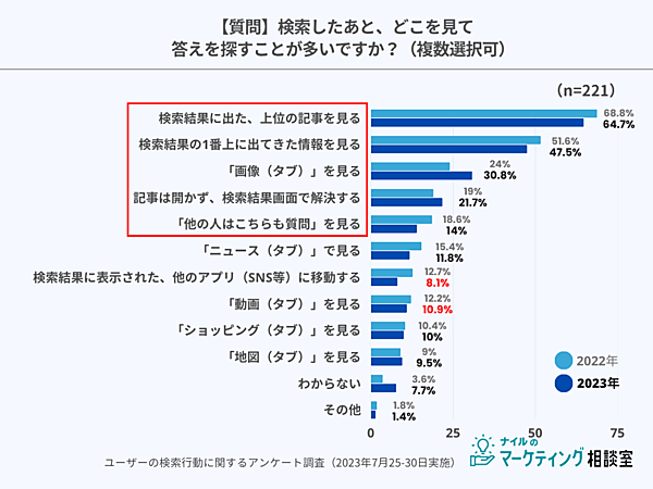 「検索キーワードの入力後、どこを見て答えを見つけるか」については、「検索結果に出た、上位の記事をみる」64.7%、「1番上に出てきた情報を見る」47.5%、「画像(タブ)を見る」30.8%が上位だった。
