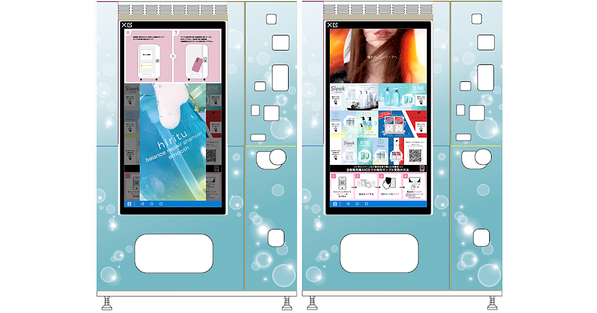 サシェは1回分の小袋。サンプリングは、流通小売り向けDX(デジタル変革)支援事業などを手掛けるアドインテが運営する自販機「AIICO(アイコ)」を利用する。AIICOは、サイネージ型IoT自販機にサンプリングとマーケティングの要素を組み合わせた“マーケティングマシーン”といい、データの活用で新たな販売促進戦略が構築できる。