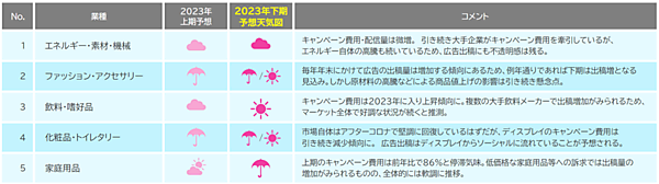 また2023年下期の業種別出稿動向予測では、ここ数年好調だった「家庭用品」のさらなる停滞などが予測されている。